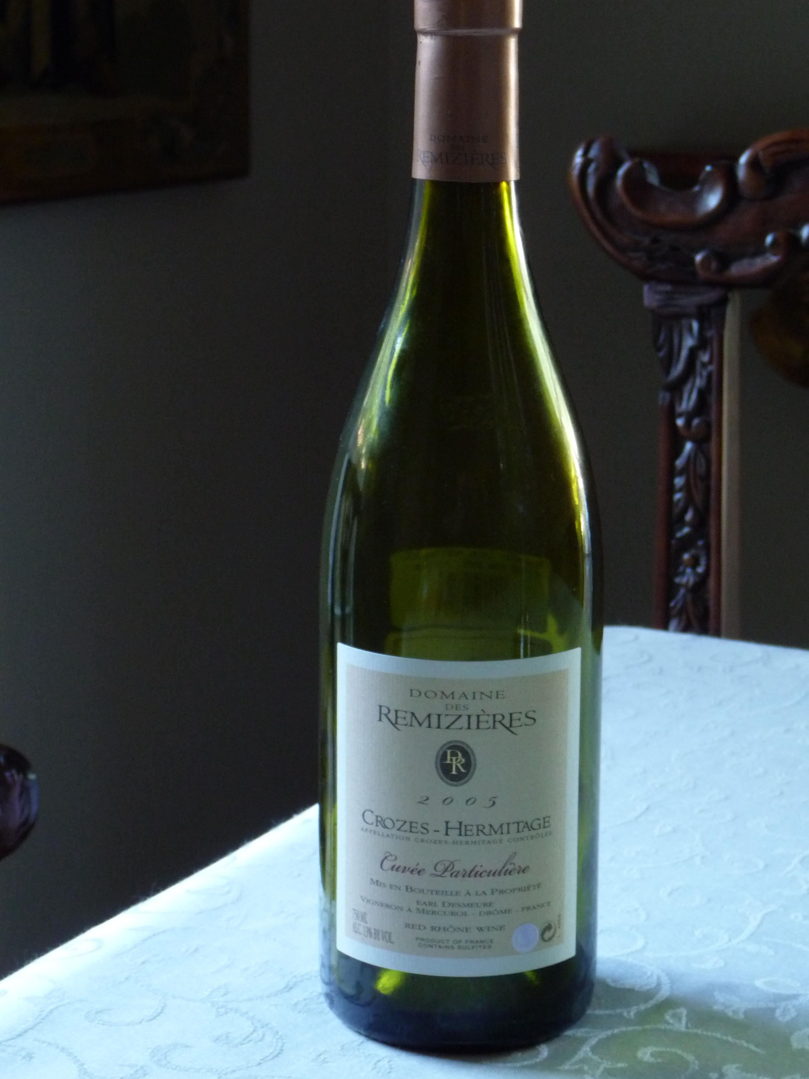 Then came the time to choose a wine. The flavors that came to mind when I started thinking were truffles, cheese and bacon. The bacon set off a bell in my mind because I learned in my class this week that bacon is an aroma marker for Syrah based wines from the Northern Rhone region of France. But I was concerned about the truffles as I got into trouble with them in my previous effort. So I decided to research the Northern Rhone to find out if truffles grow there on the premise that regional foods often pair well with regional wine. When I discovered that the Northern Rhone Valley is, indeed, truffle territory, I chose a 1995 Crozes-Hermitage.